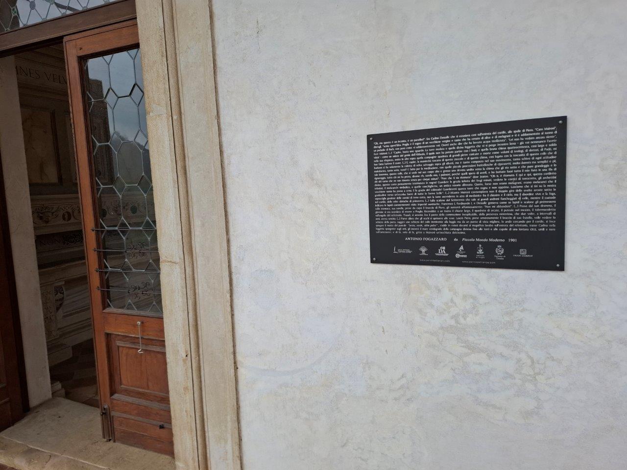 - Abbazia di Praglia, una targa posta dalla rete dei Parchi Letterari ricorda il passaggio di Antonio Fogazzaro che, proprio qui, trovò ispirazione per il suo “Piccolo mondo moderno” nel 1901. Foto Marco Giovenco