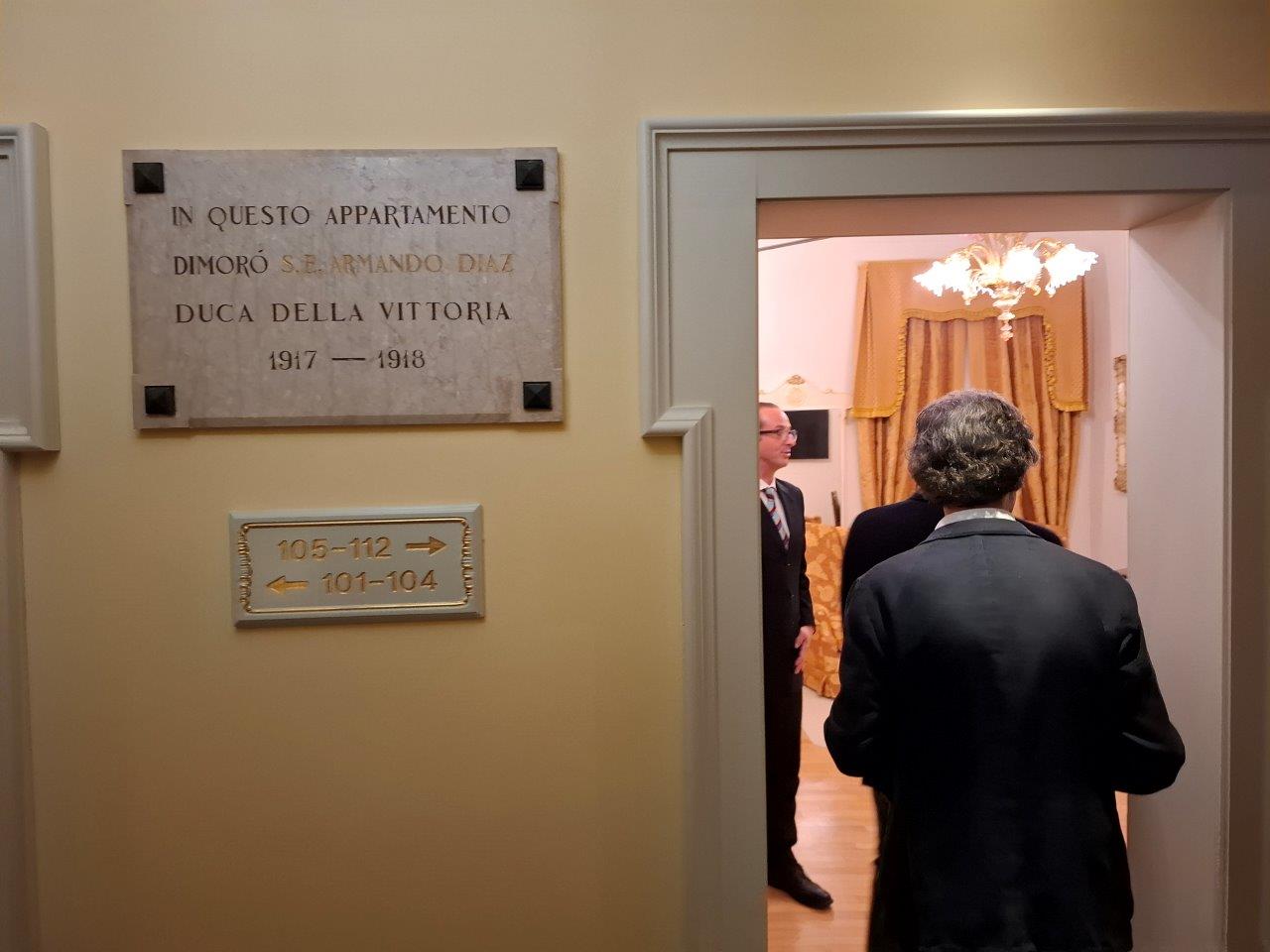 racconta quella storia meglio di qualsiasi archivio. È la “stanza 110”, dove Diaz lavorò negli ultimi giorni del conflitto. Quando Padova, iniziale quartier generale, divenne troppo esposta ai bombardamenti austriaci, lo Stato Maggiore arretrò fino ad Abano. Il Trieste & Victoria si trasformò così nella sede operativa del Comando Supremo di Stato Maggiore dell’Esercito italiano. Qui passarono anche Pietro Badoglio e Gabriele d’Annunzio, presenze tutt’altro che marginali: fu proprio quest’ultimo a suggerire ai proprietari di aggiungere “Victoria” al nome dell’hotel, per fissare nel luogo il segno della vittoria.