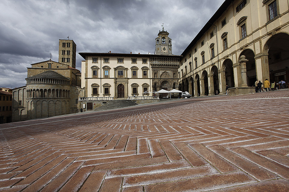 Chi visita Arezzo in un giorno non può non passare per Piazza Grande, il fulcro della città. Detta anche Piazza Vasari, in onore dell’architetto aretino che costruì il Palazzo delle Logge che domina la piazza, ha un’insolita forma trapezoidale e si sviluppa su un piano inclinato con un dislivello di circa dieci metri. È una piazza unica al mondo, dove si sovrappongono secoli di storia e monumenti importanti: il Palazzo della Fraternita dei Laici, il Palazzo delle Logge e la Pieve di Santa Maria, uno dei massimi esempi di architettura romanica.