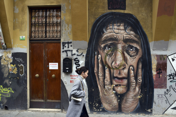 Sulla serranda al civico 19 ci sono i due giovani legati e imbavagliati di Psiko, al 50 e 52 i volti femminili di Ale Senso, simboli della violenza alle donne, il primo coi topolini, il secondo, botticelliano, coi rampicanti verdi tra i capelli rossi. All’82 c’è la lugubre figura di DissensoCognitivo, lunghe dita, nasino appuntito, libretto rosso appiccicato agli occhi e al 90, il vecchio ieratico di About Ponny, sempre visibile perché il teatro di poche pretese che sta qui dietro lo apriranno una o due volte all’anno.