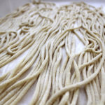 Gli ingredienti dell’antichissima ricetta originale sono quattro: acqua, farina, un po’ di sale e poi – e qui viene il bello – la capacità di saperli fare, di saper impastare a lungo e infine di riuscire a ricavare, “appiciando” sotto il palmo della mano, questi spaghettoni abbastanza grossolani.