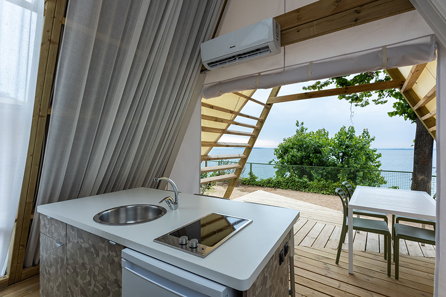 Grande classico intramontabile e immancabile, naturalmente, sono i cottage, (chiamati anche mobile homes o maxi caravan): le dotazioni, ma questo è scontato, sono complete come quelle di una casa e lo stile più amato è quello minimal chic, con design di ispirazione scandinava, declinato attraverso l’uso diparticolari in legno, elementi sapientemente dosati in metallo, cromie a contrasto e panoramiche pareti a scorrimento in vetro. L’effetto è quello di un sofisticato boutique hotel, con il vantaggio, però, di avere un angolo cottura con tanto di set coordinati da vera e propria art de la table. Chi desidera godere di un punto di vista speciale, deve scegliere quelle con affaccio diretto sul lago. Le serate in veranda con vista sul blu, godendo dell’ombra delle piante della propria area di giardino, o i momenti nella jacuzzi privata sono semplicemente perfetti. Con tutto il piacere di un’informalità vicinissima alla natura e lontana dalla rigidità del quotidiano. Let’s go glamping!