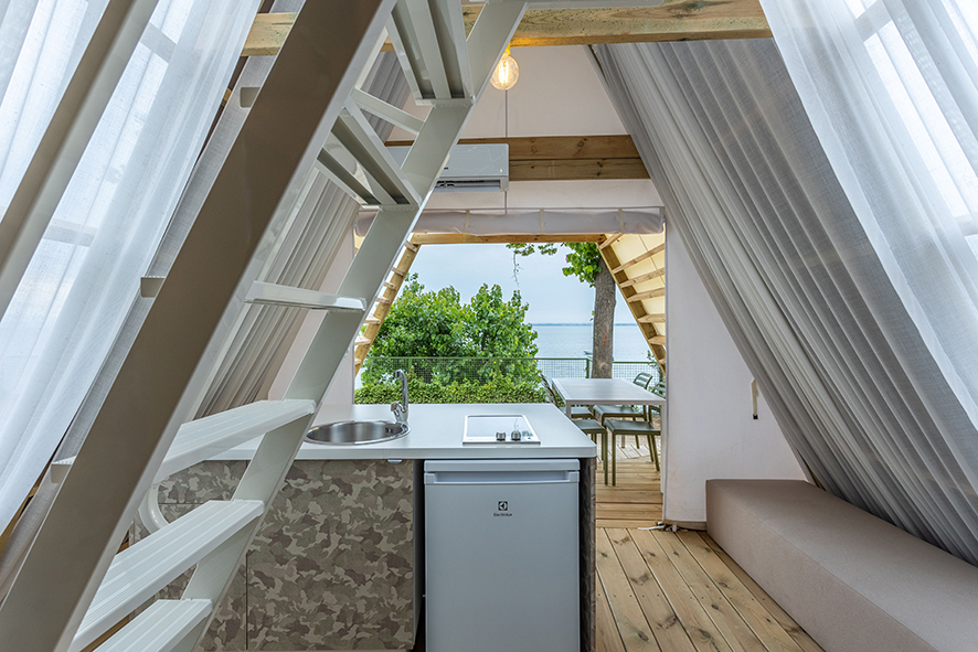 Grande classico intramontabile e immancabile, naturalmente, sono i cottage, (chiamati anche mobile homes o maxi caravan): le dotazioni, ma questo è scontato, sono complete come quelle di una casa e lo stile più amato è quello minimal chic, con design di ispirazione scandinava, declinato attraverso l’uso diparticolari in legno, elementi sapientemente dosati in metallo, cromie a contrasto e panoramiche pareti a scorrimento in vetro. L’effetto è quello di un sofisticato boutique hotel, con il vantaggio, però, di avere un angolo cottura con tanto di set coordinati da vera e propria art de la table. Chi desidera godere di un punto di vista speciale, deve scegliere quelle con affaccio diretto sul lago. Le serate in veranda con vista sul blu, godendo dell’ombra delle piante della propria area di giardino, o i momenti nella jacuzzi privata sono semplicemente perfetti. Con tutto il piacere di un’informalità vicinissima alla natura e lontana dalla rigidità del quotidiano. Let’s go glamping!