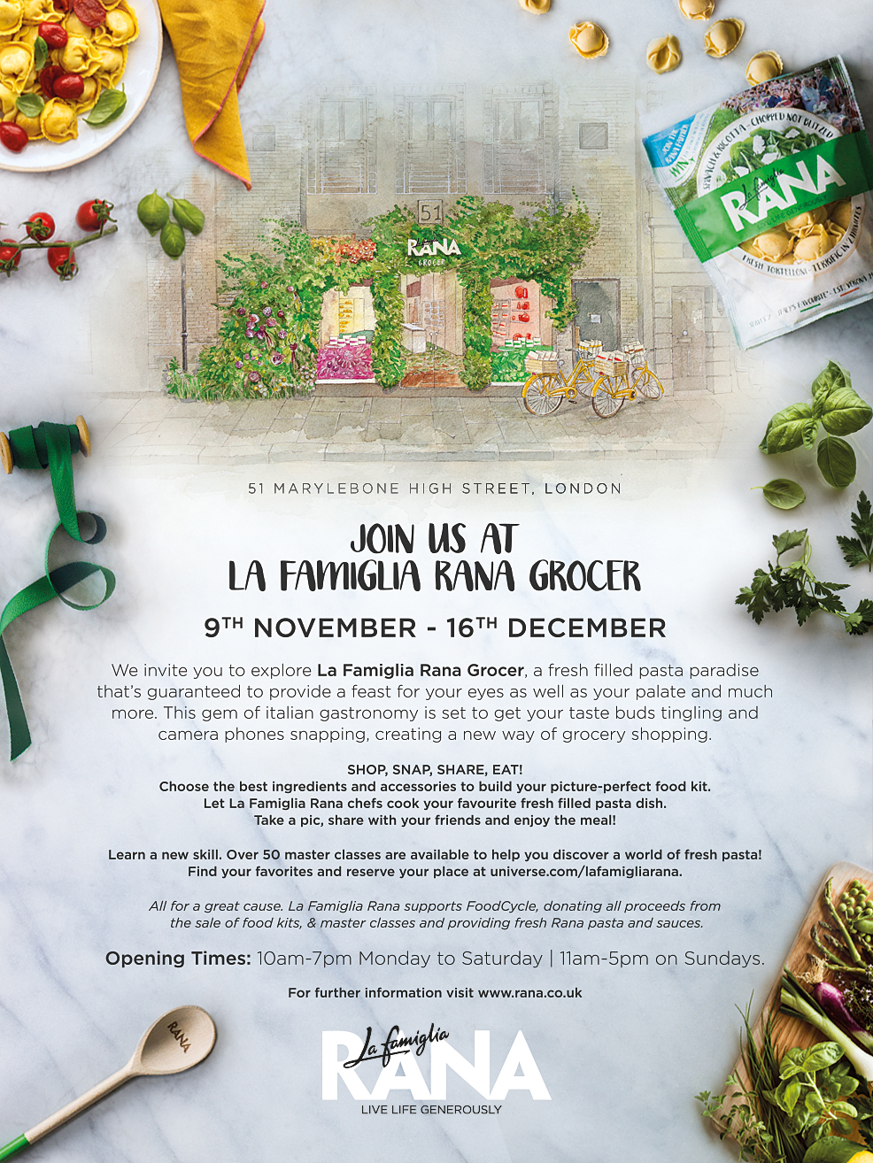 Per completare l’esperienza, durante le cinque settimane di apertura, il Grocer londinese si animerà con 50 divertenti workshop tra cui: imparare a fare la pasta fresca a mano, creare originali menù di pasta in pochi minuti, decorare la tavola, fotografare il cibo senza tradirne la freschezza. I workshop saranno tenuti da numerosi membri della grande famiglia Rana, da Antonella Rana agli chef del Pastificio Rana, oltre che da alcuni dei più amati instagrammers inglesi tra cui Food Feels, Cutlery Chronicles e Giulia Mule. L’elenco completo dei corsi si trova su: www.universe.com/lafamigliarana. Per partecipare è sufficiente iscriversi online pagando una quota di 5 sterline che, anche in questo caso, verrà devoluta a Foodcycle.