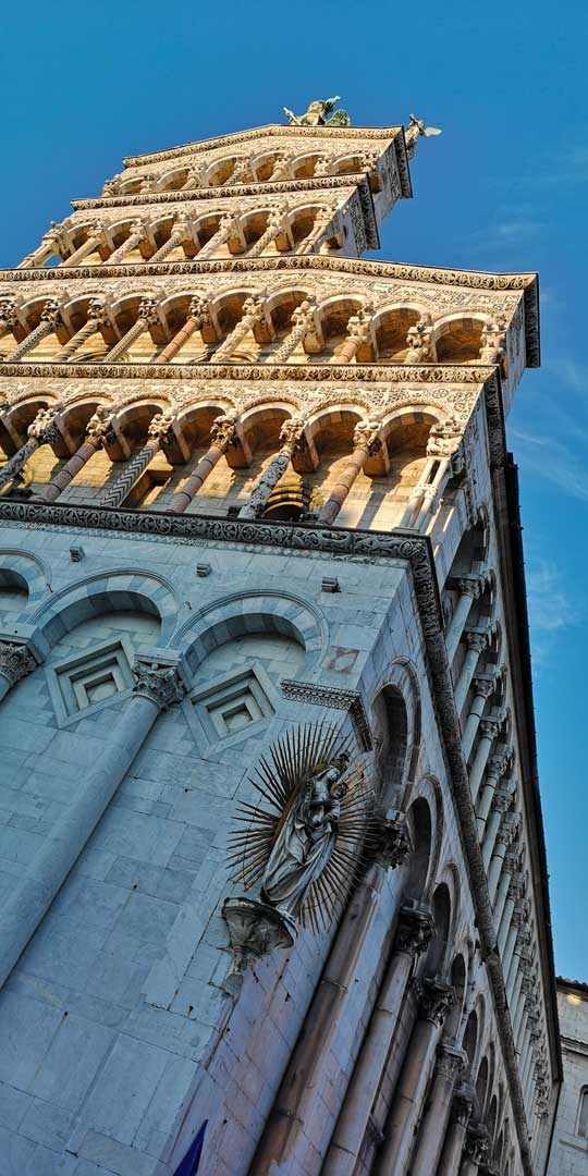 Si parte da piazzale Vittorio Emanuele per andare alla scoperta delle meraviglie cittadine: il caffè delle Mura; la cattedrale di san Martino; via dei Fossi; l’Orto Botanico; la torre Guinigi, inconfondibile con il suo pennacchio verde di lecci, e la compagna Torre delle Ore; il museo della Via Francigena; il seicentesco Palazzo Pfanner e la ciminiera della Manifattura dei Tabacchi di Lucca.