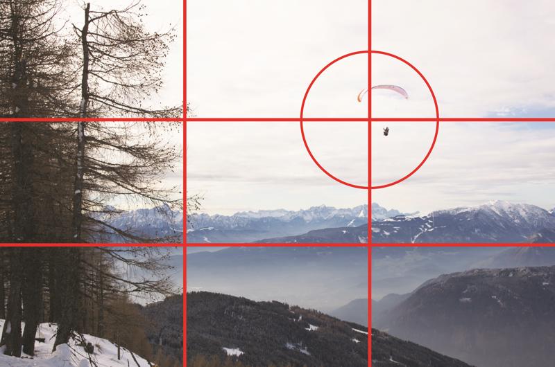 Un risultato soddisfacente non si ottiene solamente con l’applicazione di regole: sovvertire la logica può produrre immagini interessanti, insolite per l’occhio, provocatorie. Insomma, sperimentare è sempre positivo. Nonostante questo, è sempre utile conoscere indicazioni su cui basarsi: per posizionare i soggetti nello spazio in modo equilibrato, dinamico e interessante, ci sono comunque gli schemi da seguire. Il più conosciuto, comprensibile e facilmente applicabile è la regola dei terzi: se si immagina di dividere l’inquadratura con due linee verticali e due linee orizzontali poste a 1/3 e 2/3, le linee si incontrano nel mezzo, in modo regolare formando 4 incroci, e formando anche 9 caselle. La regola consiglia di posizionare gli oggetti in corrispondenza degli incroci o facendo combaciare linee dell’immagine con le linee della griglia dei terzi (per esempio l’orizzonte con la riga alta).