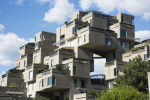 - Le facciate e gli spigoli del complesso Habitat 67, a Montreal, sono enfatizzati dalla luce dura emessa dal sole estivo nelle ore centrali del giorno