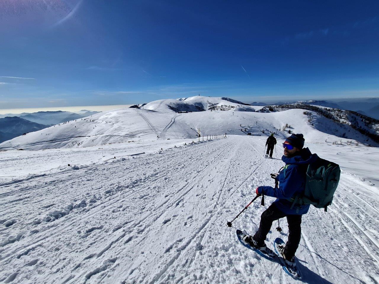A quota 1800, il Plan è il cuore della neve per famiglie: piste per principianti e sciatori intermedi, aree dedicate ai più piccoli, ciaspolate e scialpinismo verso il Monte Muffetto (2.060 m. slm) o il Dosso Rotondo. Quest’ultimo è l’itinerario che abbiamo percorso noi partendo direttamente dalla seggiovia Larice al Plan a quota 1.700: dotati di ARVA (dispositivo per localizzare chi viene travolto da valanghe), pala e sonda – tre strumenti obbligatori per praticare ciaspolate e scialpinismo – si percorre una pista battuta lungo la dorsale che collega alla cima del Monte Splaza (1.824 m. slm) e proseguendo fino al rifugio Dosso Rotondo. Il dislivello non è eccessivo e soltanto un paio di punti richiedono un maggiore sforzo. Partendo dal parcheggio Plan sono necessarie circa 4 ore di cammino in un contesto soleggiato dalla mattina al tramonto e una vista che spazia a 360 gradi dalla Val Camonica al Garda fino all’Adamello.