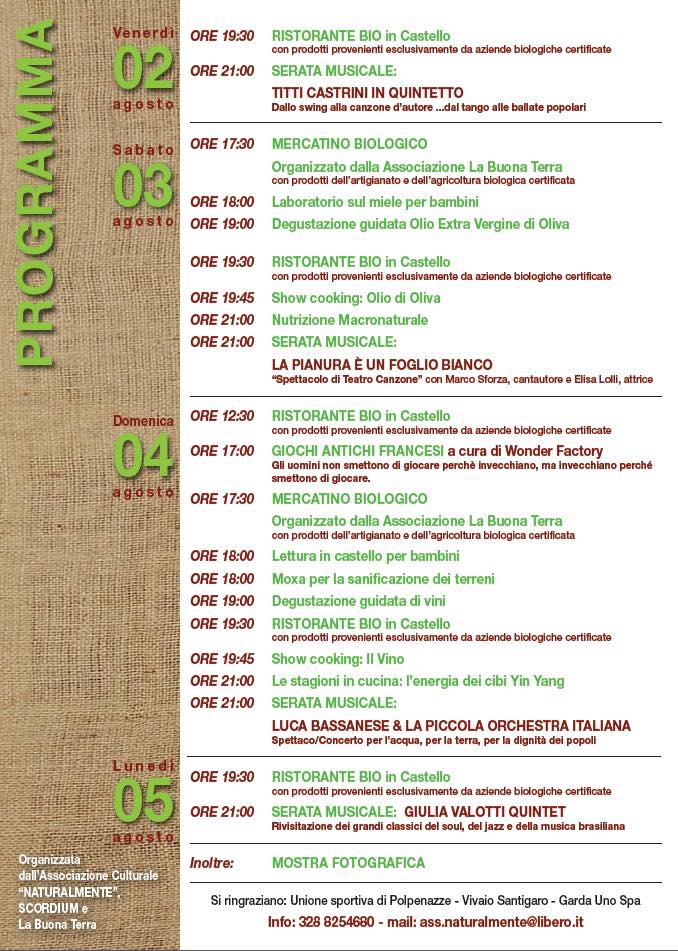 Torna al castello di Polpenazze del Garda la BioFesta, tradizionale appuntamento estivo sul lago di Garda dedicato ai prodotti biologici della zona di Brescia e di tutta la Lombardia. Giunta alla 21° edizione, la manifestazione vuole promuovere l’autentica cultura del biologico attraverso appuntamenti enogastronomici, musicali e culturali.