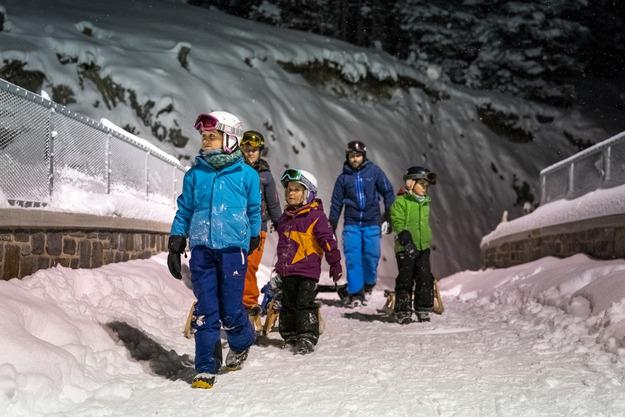 - Famiglia durante una discesa notturna in slittino sulla strada del Passo dell’Albula da Preda a Bergün.