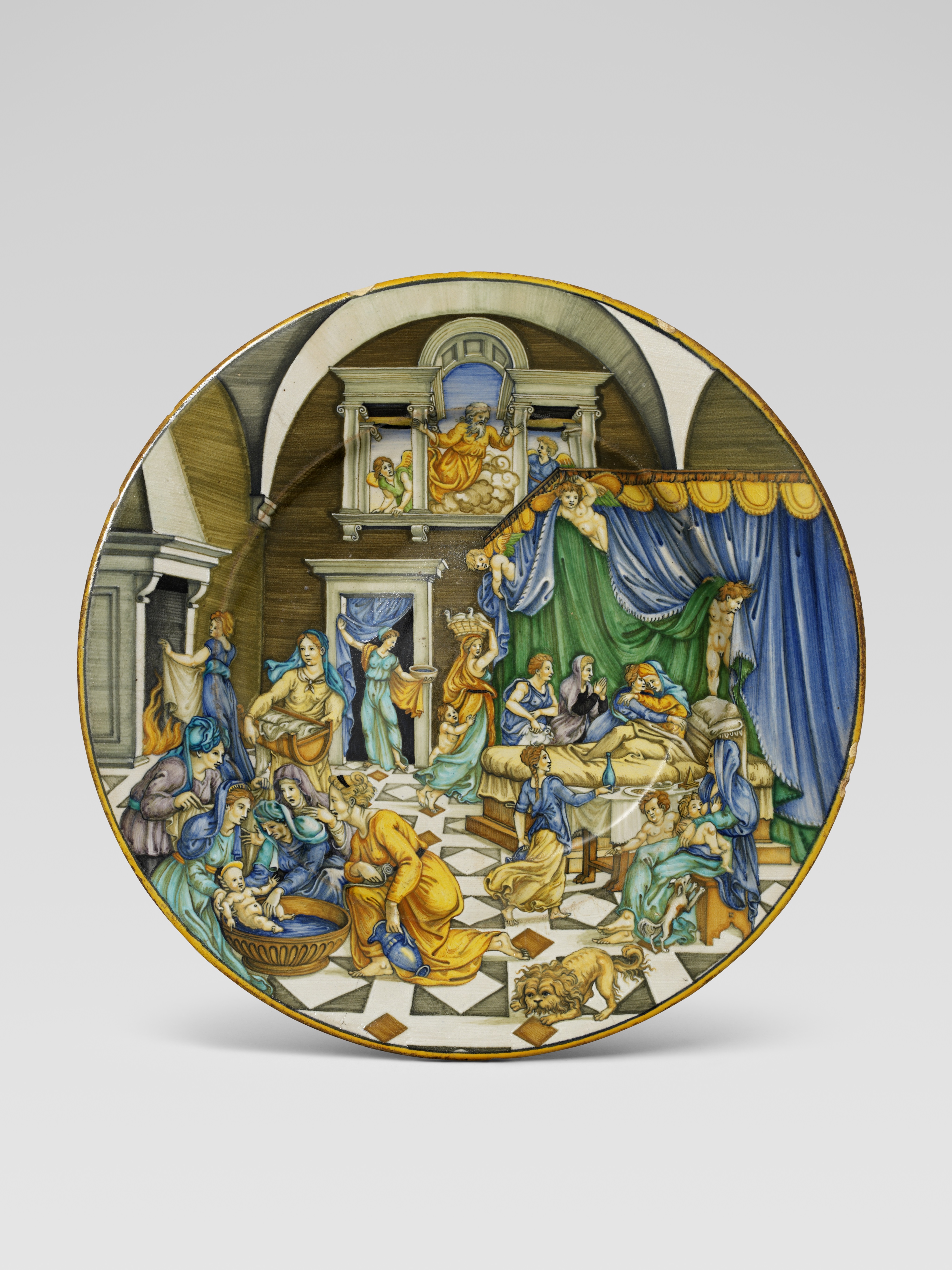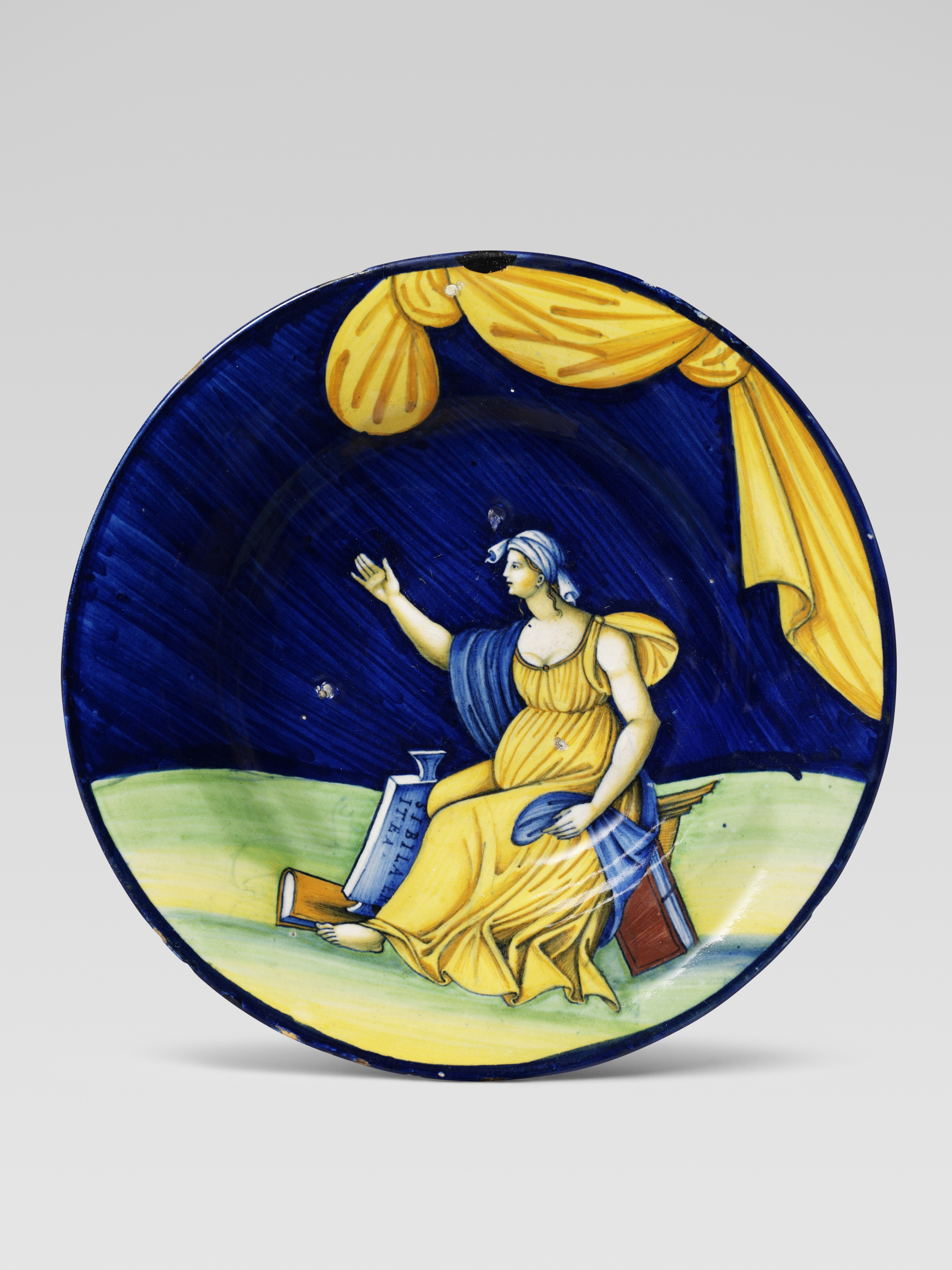 La maiolica rinascimentale italiana è l’unica forma d’arte che ha conservato in modo così perfetto i colori originari di quando fu realizzata, rispecchiando il mondo in cui vivevano le donne e gli uomini di quell’epoca. La tecnica consiste nel rivestire di uno smalto bianco opaco a base di stagno la superficie di oggetti in terracotta e nel dipingervi sopra con ossidi metallici, che virano in brillanti colori dopo la cottura: dal cobalto si ricava il blu, dal rame il verde, dal ferro l’arancio o l’ocra, dall’antimonio il giallo, dal manganese il porpora o marrone e dallo stagno il bianco. Ha lontane origini islamiche e giunse in Europa con la conquista musulmana della penisola iberica nell’VIII secolo, dove fu impreziosita con il lustro, che consentiva di ottenere il colore dell’oro o del rubino con sfumature cangianti o iridescenti, invenzione dei vasai di Malaga (da qui la parola “maiolica”) e del Regno di Valencia. Esportata con successo in tutta Europa, essa influenzò gli sviluppi dell’arte ceramica in Italia, praticata in numerosi centri della Toscana, dell’Emilia, delle Marche e dell’Umbria. Con grande inventiva i ceramisti italiani innovarono la tradizione ispano-moresca contaminandola con motivi ispirati al repertorio gotico e rinascimentale e altri derivanti dalle porcellane cinesi.